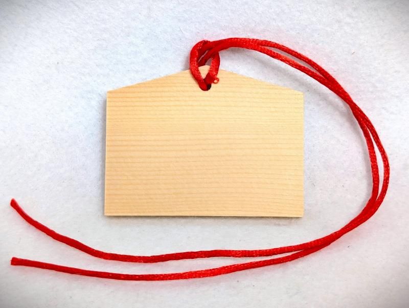 仕様: 木製ミニ絵馬型プレート / 片面無地(書き込み用)/ 赤い紐付き